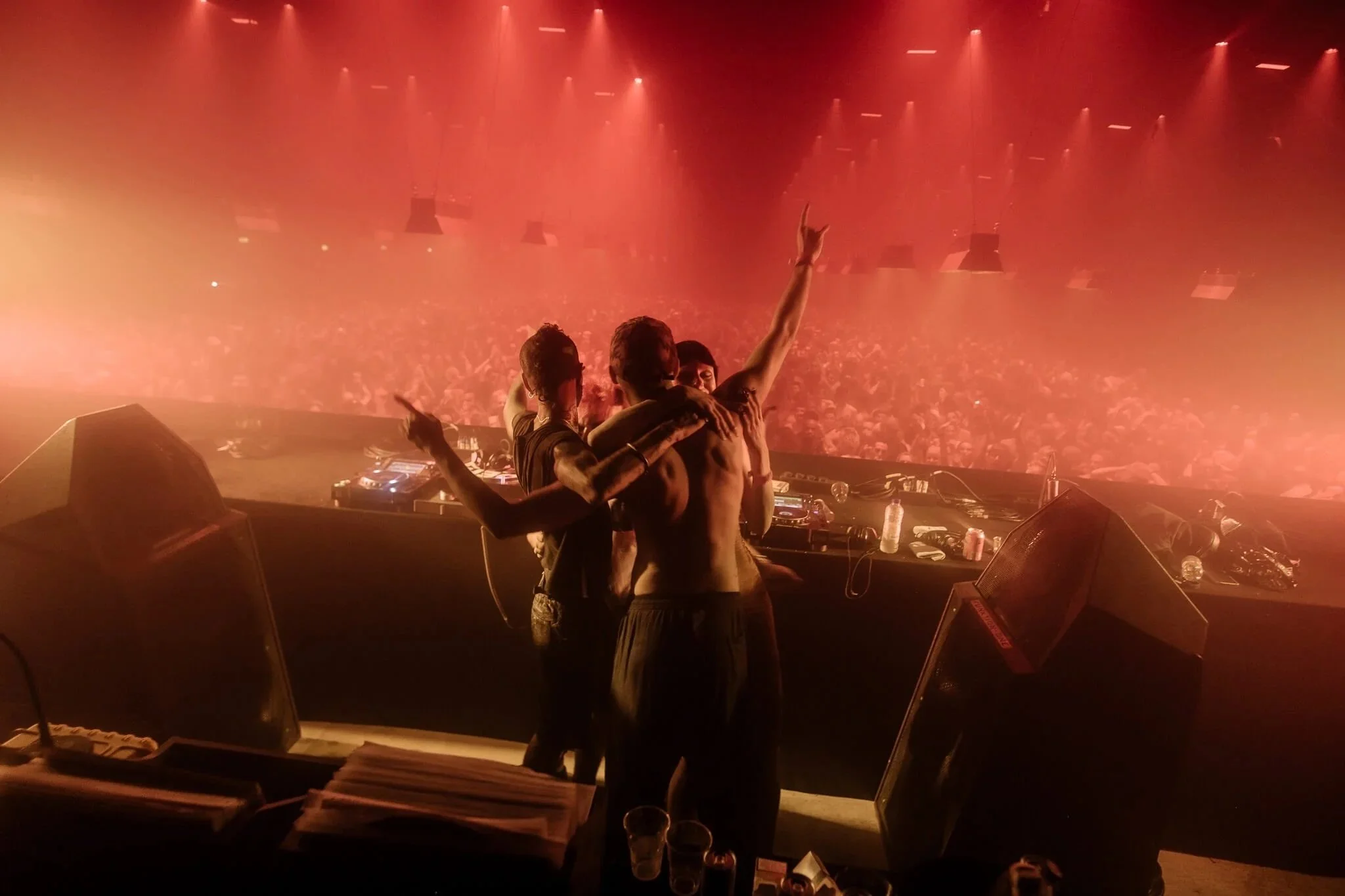 A throuple started the night by playing on a platform under light beams.